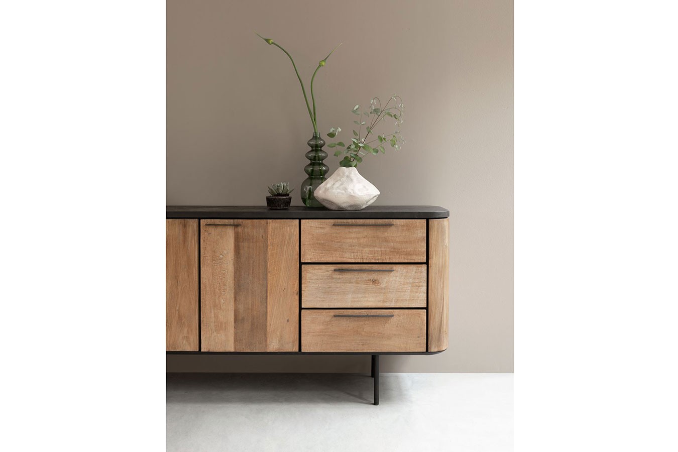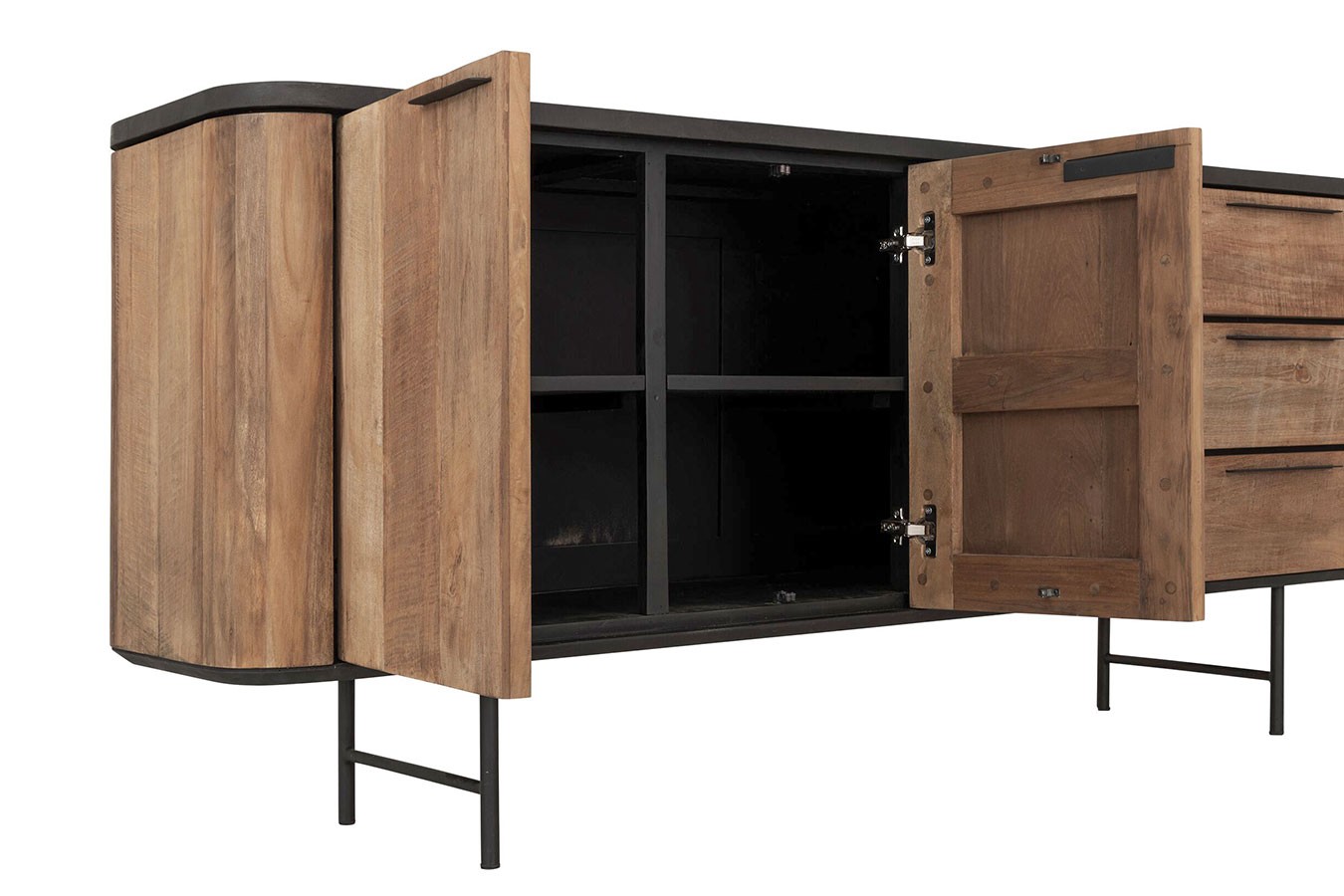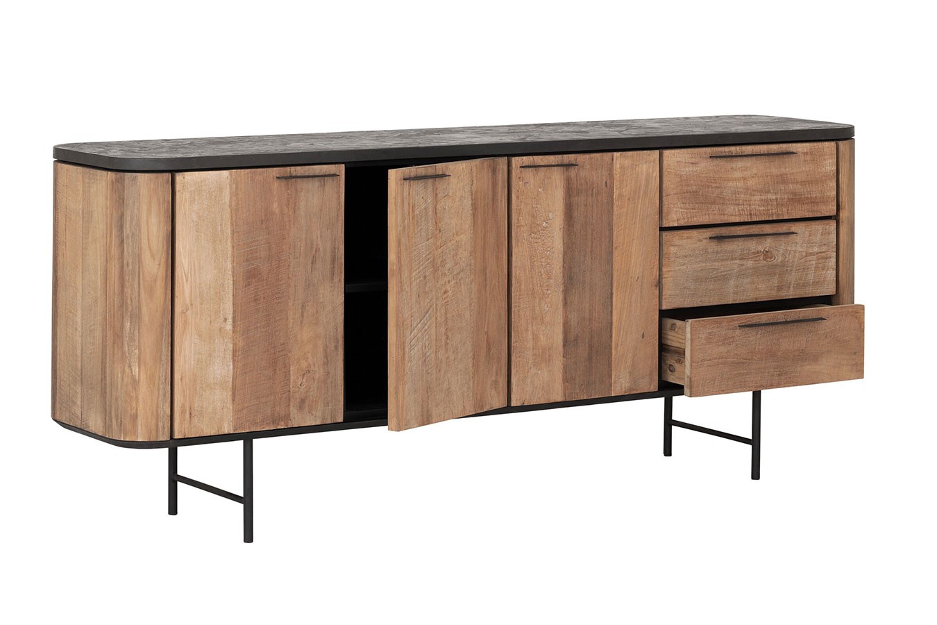 Bringen Sie mit unserer Anrichte im Industrial-Stil aus recyceltem Teakholz, Mortex und Metallfüßen zeitlose Eleganz und modernes Design in Ihr Zuhause und schaffen Sie einen Raum, der zum Entdecken und Verweilen einlädt.