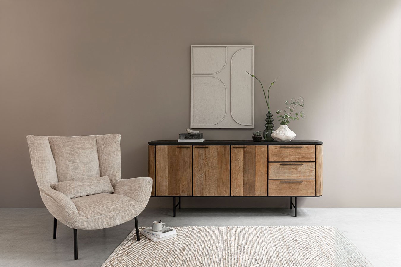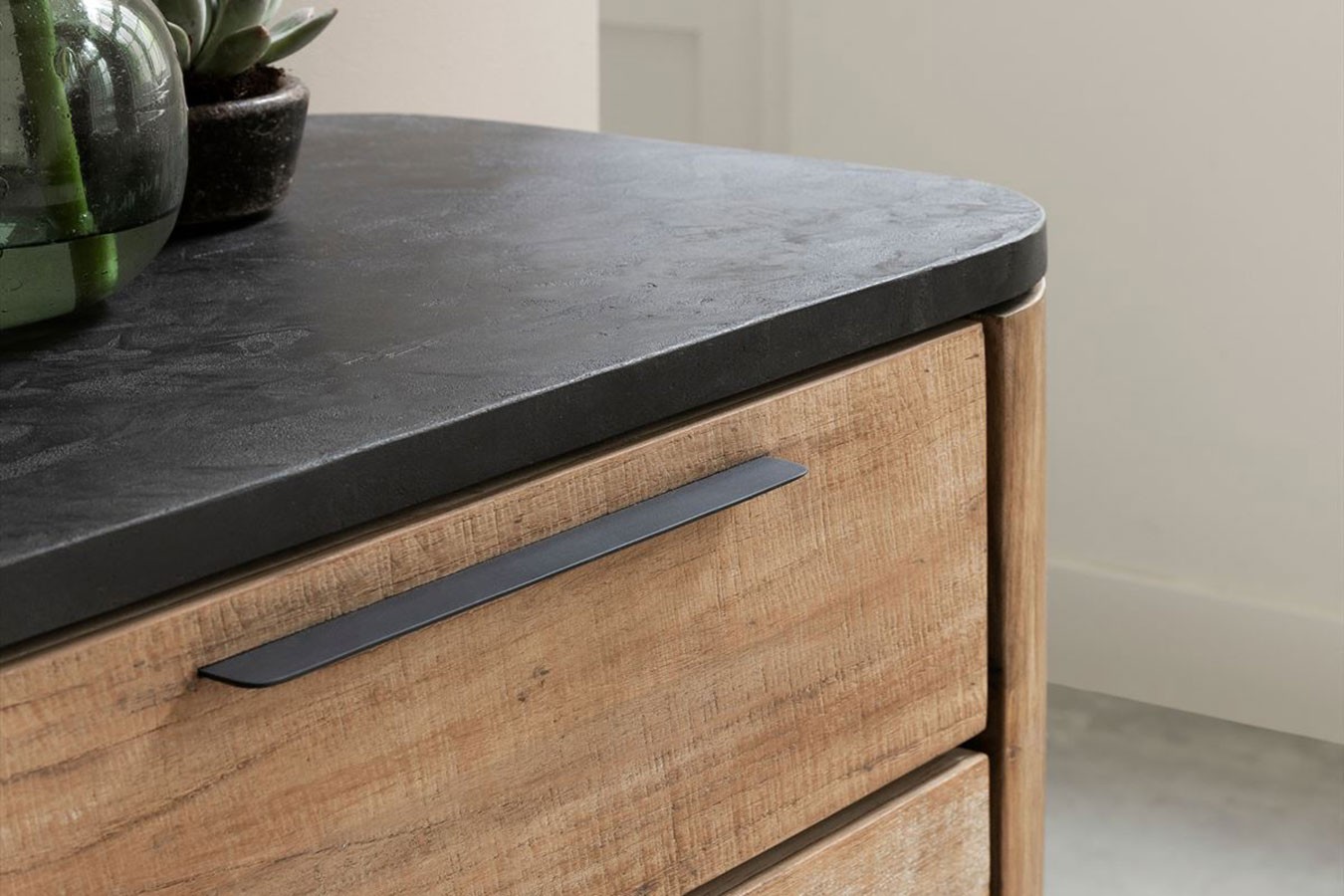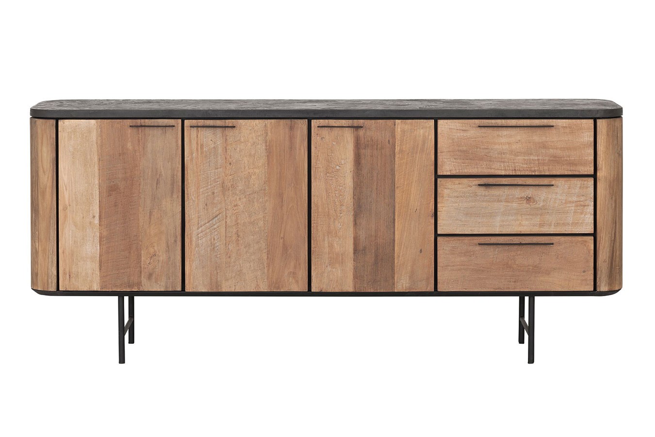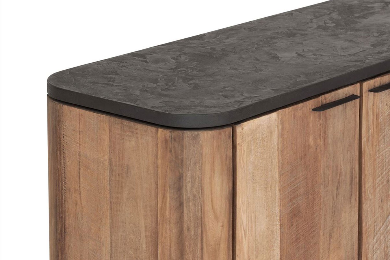 Bringen Sie mit unserer Anrichte im Industrial-Stil aus recyceltem Teakholz, Mortex und Metallfüßen zeitlose Eleganz und modernes Design in Ihr Zuhause und schaffen Sie einen Raum, der zum Entdecken und Verweilen einlädt.