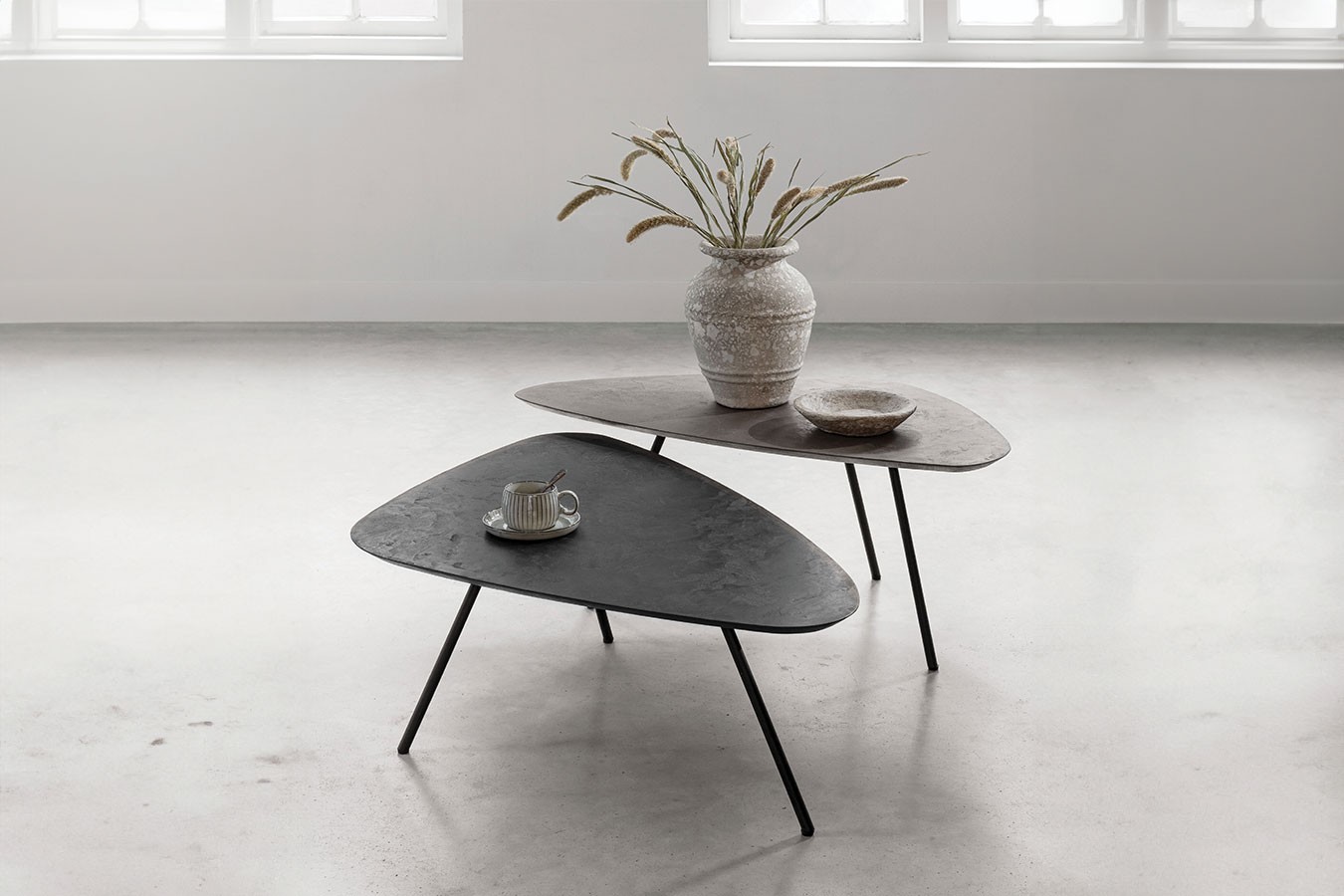 Die dreieckige Formgebung der Tische erzeugt eine dynamische und zugleich elegante Ästhetik, die jeden Raum bereichert. Getragen werden die Tische von jeweils drei filigranen Metallfüßen in Schwarz, die nicht nur für Stabilität sorgen, sondern auch einen kontrastreichen Akzent setzen und das moderne Design perfekt abrunden.