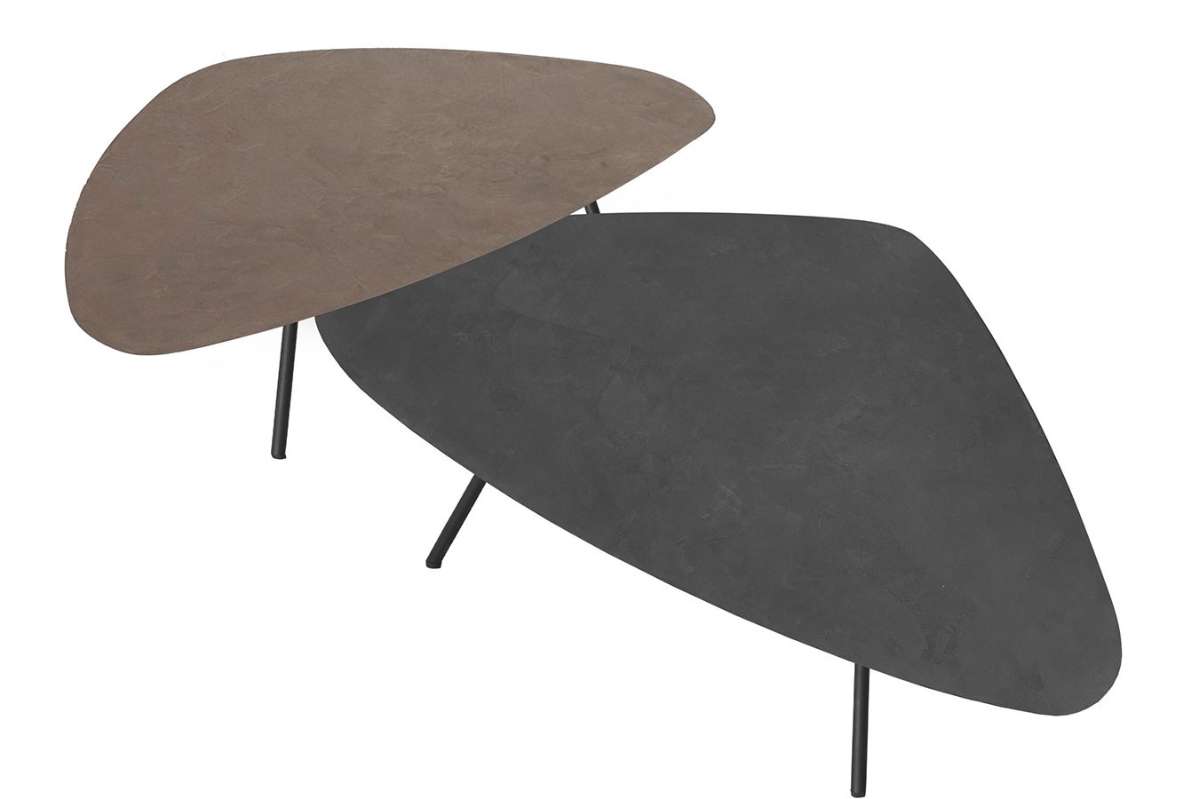 Wohnzimmertisch, dreieckig, 100% Mortex, handgefertigt, zwei Grautöne, Metallfüße schwarz, 2 Größen