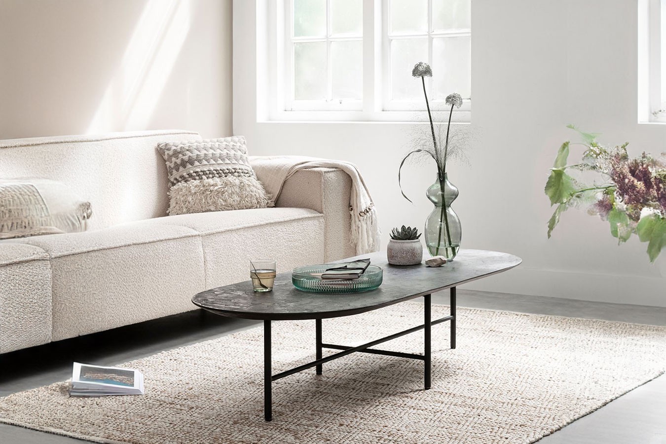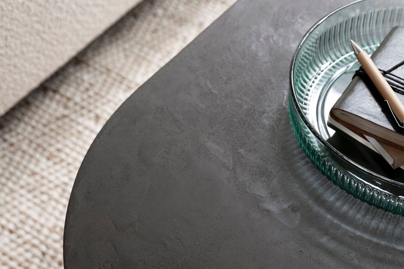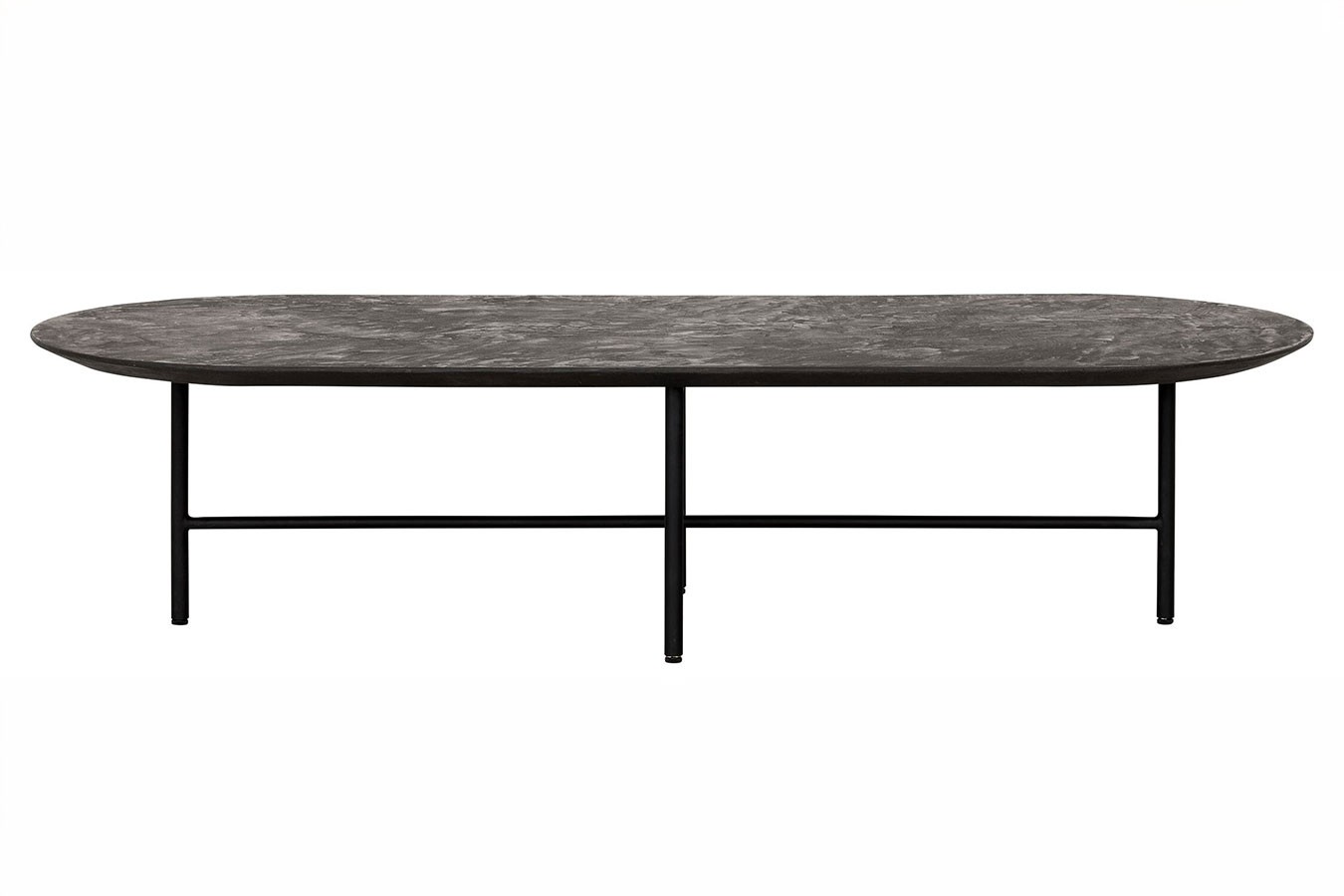 Bringen Sie mit unserem ovalen Couchtisch im Industrial-Stil aus schwarzem Mortex und Metallgestell zeitlose Eleganz und modernes Design in Ihr Zuhause und schaffen Sie einen Wohnbereich, der zum Verweilen und Entspannen einlädt.