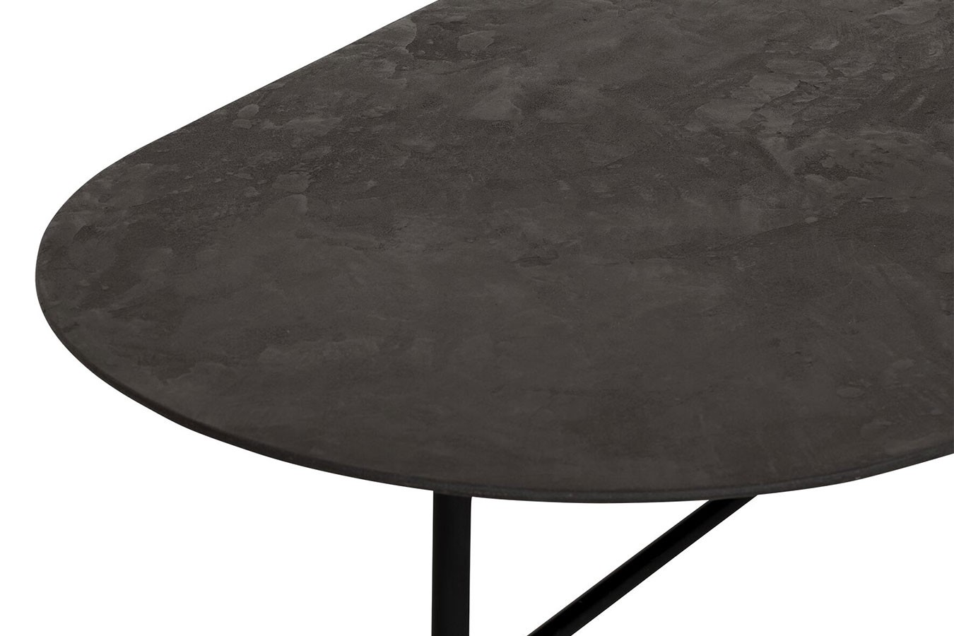 Getragen wird die Tischplatte von einem vierfüßigen Gestell aus schwarzem Metall, das nicht nur für Stabilität sorgt, sondern auch einen markanten industriellen Akzent setzt. Die klaren Linien und die minimalistische Formgebung des Gestells harmonieren perfekt mit der schlichten Eleganz der Tischplatte.