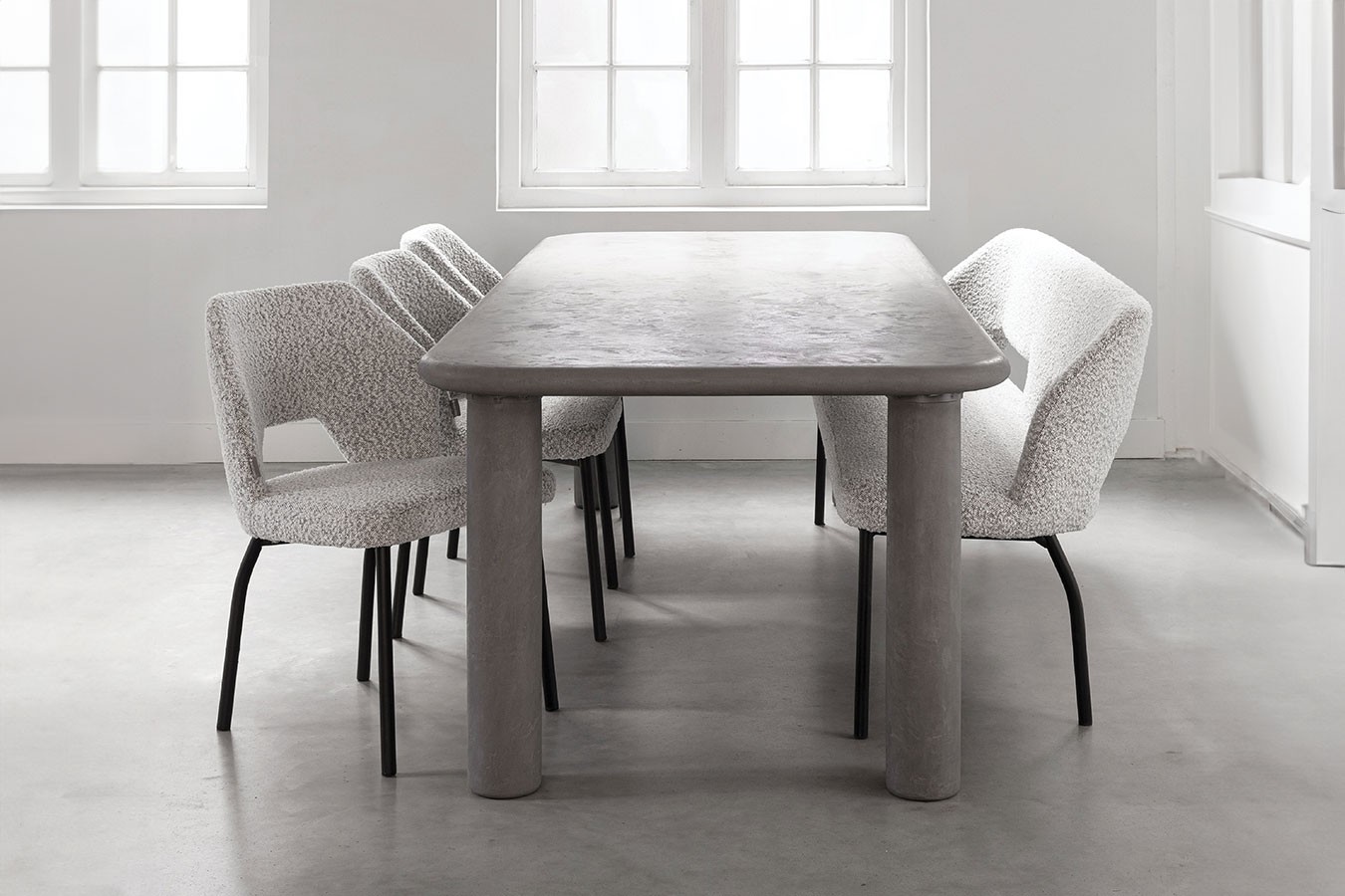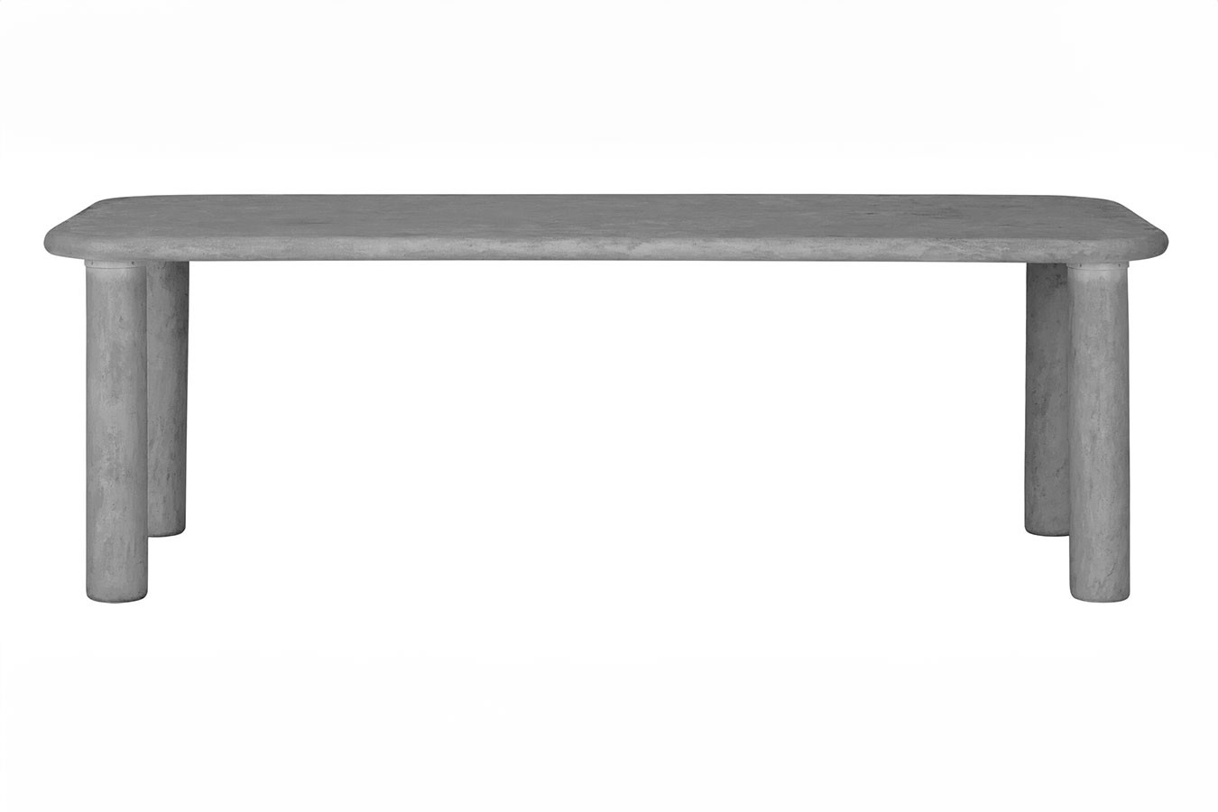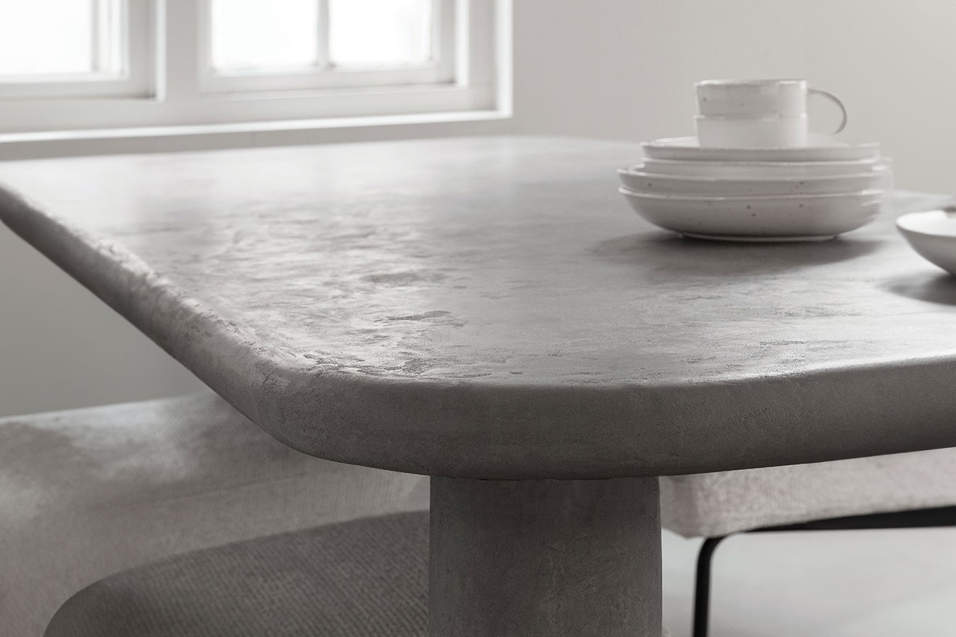 Bringen Sie mit unserem Esstisch aus Mortex in Grau und abgerundeten Kanten sowie runden, säulenförmigen Füßen zeitlose Eleganz und modernes Design in Ihr Zuhause und schaffen Sie einen Essbereich, der zum Verweilen und Genießen einlädt.