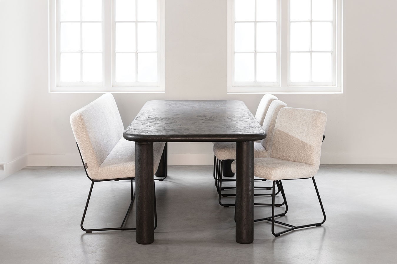 Dieser Esstisch bietet nicht nur ausreichend Platz für kulinarische Genüsse, sondern ist auch ein echtes Statement für individuellen Stil und Geschmack. Ob für gemütliche Familienessen oder festliche Anlässe mit Freunden - dieser Tisch vereint Funktionalität und Ästhetik auf höchstem Niveau und schafft eine einladende Atmosphäre in Ihrem Zuhause. Dieser einzigartige Tisch vereint schlichte Eleganz mit moderner Ästhetik und wird zum Mittelpunkt Ihres Essbereichs.Die Tischplatte mit abgerundeten Kanten präsentiert sich in edlem Schwarz und ist aus robustem Mortex gefertigt. Diese raffinierte Formgebung verleiht dem Tisch eine weiche und einladende Silhouette, während die schwarze Farbgebung eine zeitlose Eleganz ausstrahlt. Die Mortex-Oberfläche sorgt nicht nur für eine angenehme Haptik, sondern auch für eine außergewöhnliche Langlebigkeit.