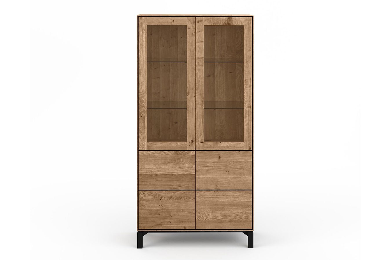 Im Inneren des Schrankes befinden sich vier Einlegeböden, die flexibel angeordnet werden können, um Ihren individuellen Anforderungen gerecht zu werden. Die Kombination aus Holz- und Glasböden verleiht dem Schrank eine interessante Struktur und setzt Ihre Lieblingsstücke gekonnt in Szene.