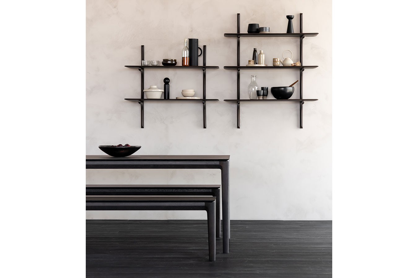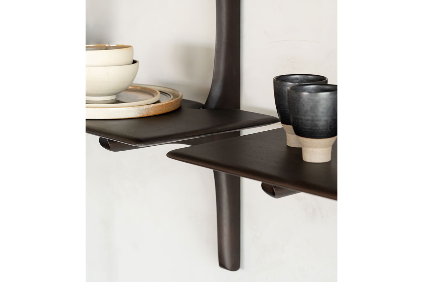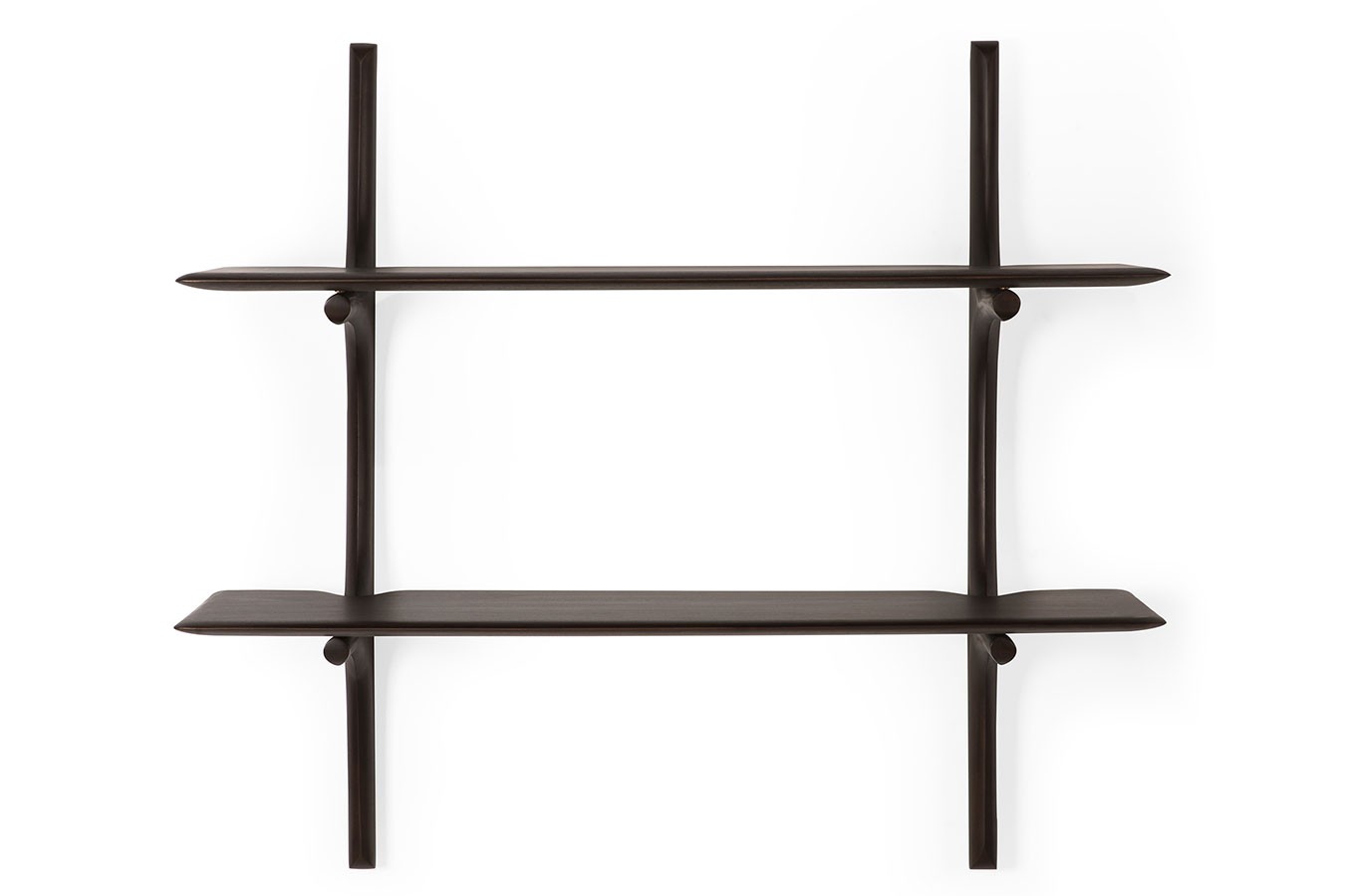 Die PI-Kollektion ehrt das Design der Natur, indem sie ihre organischen Formen und Linien bewahrt. Das Wandregal aus dunkelbraun gefärbtem Mahagoni-Holz präsentiert sich mit zwei übereinander angeordneten Böden, die sanft geschwungen aus der Wandhalterung herauswachsen. Jedes Exemplar wird von Hand veredelt – so entsteht ein einzigartiges Finish, das die natürliche Struktur des Holzes sichtbar macht. Das Regal kombiniert skandinavische Leichtigkeit mit skulpturaler Präsenz und bietet eine stilvolle Bühne für Bücher, Objekte oder Erinnerungsstücke.